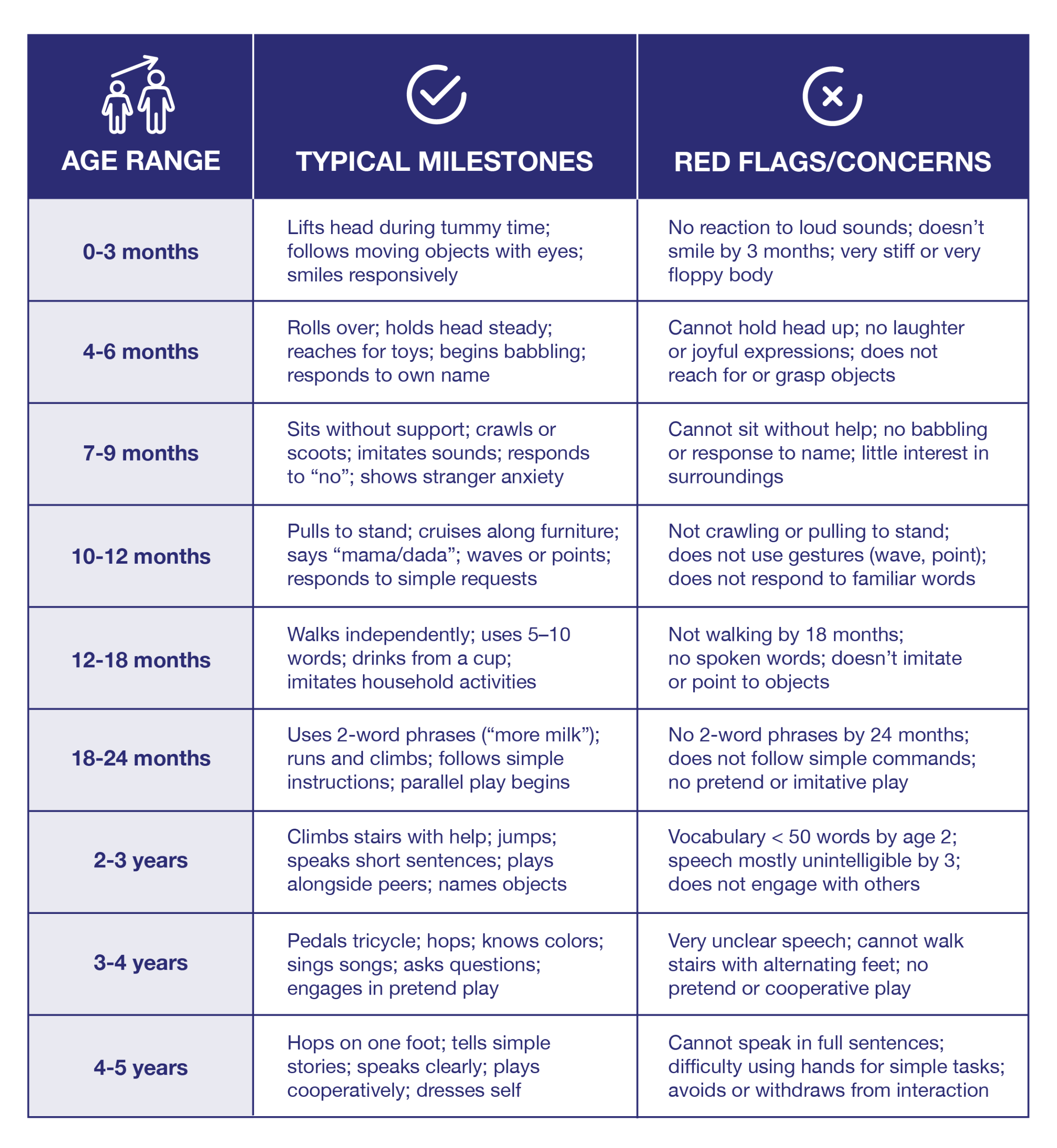 Note: This chart should not replace medical advice. If multiple milestones are missed (or if you notice any of these red flags), seek evaluation from a pediatrician. For ongoing tracking, the CDC milestone tracker is a useful additional resource.